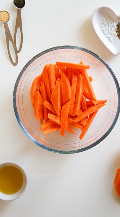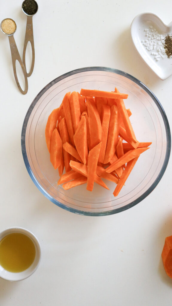 - Wash and peel the sweet potatoes, then cut them into thin, uniform strips.