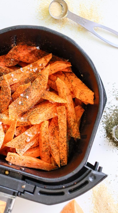 - Divide the seasoned sweet potato strips into batches and place them in the air fryer basket in a single layer, without overcrowding.