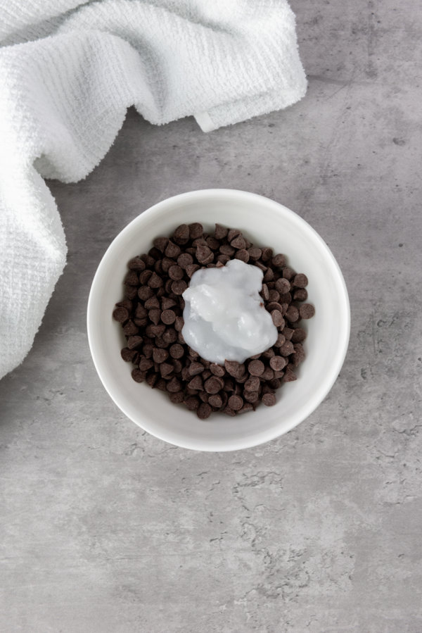 1. Melt the chocolate: Put your chocolate chips and coconut oil together in a microwave-safe bowl. Microwave them for about 2 minutes total, or until everything’s melted. I usually check it after a minute and give it a stir, then keep going! Once it’s all melted, whisk it together really well so the coconut oil and chocolate combine into one smooth mixture.