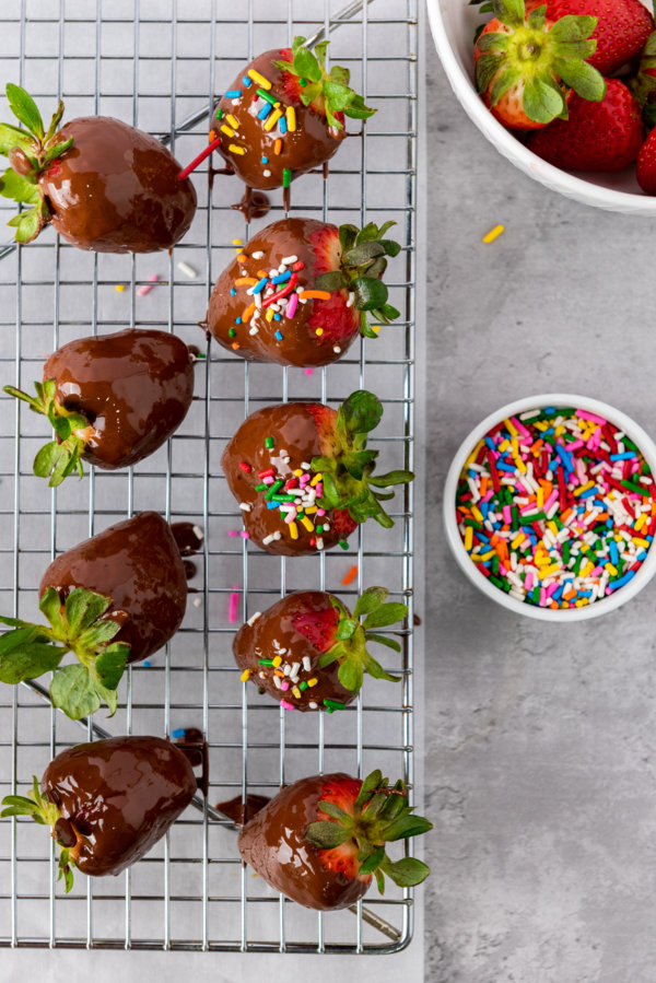 3. Let them drain and top with sprinkles: Put your dipped strawberries on a wire rack with some parchment paper underneath to catch drips. The wire rack lets air get under them so the bottoms dry too! If you don’t have a wire rack just use a baking sheet with parchment paper, that works fine too. If using sprinkles, sprinkle them on the chocolate-dipped strawberries now.