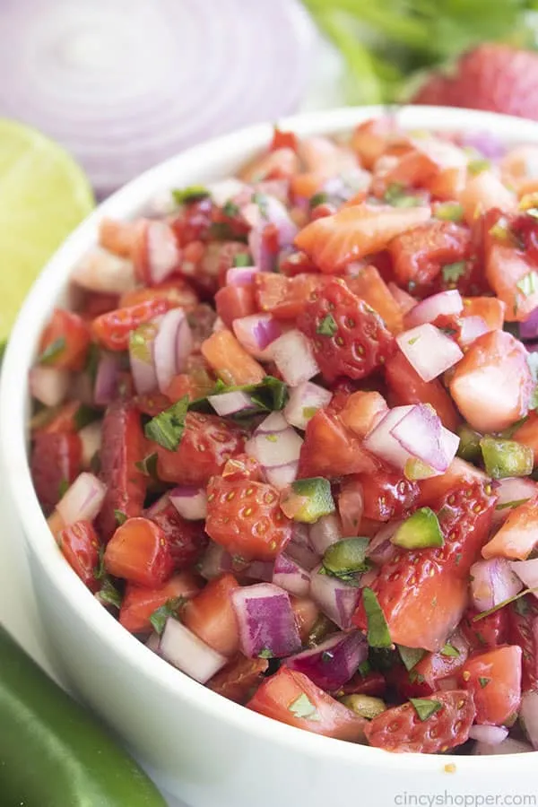 This Strawberry Salsa is a fresh, fruity take on the classic Mexican condiment and it is absolutely delightful. You can crank the heat up or down on this simple homemade recipe depending on your crowd. Serve it with cinnamon chips for a sweet appetizer or alongside grilled chicken for something a little more savory.