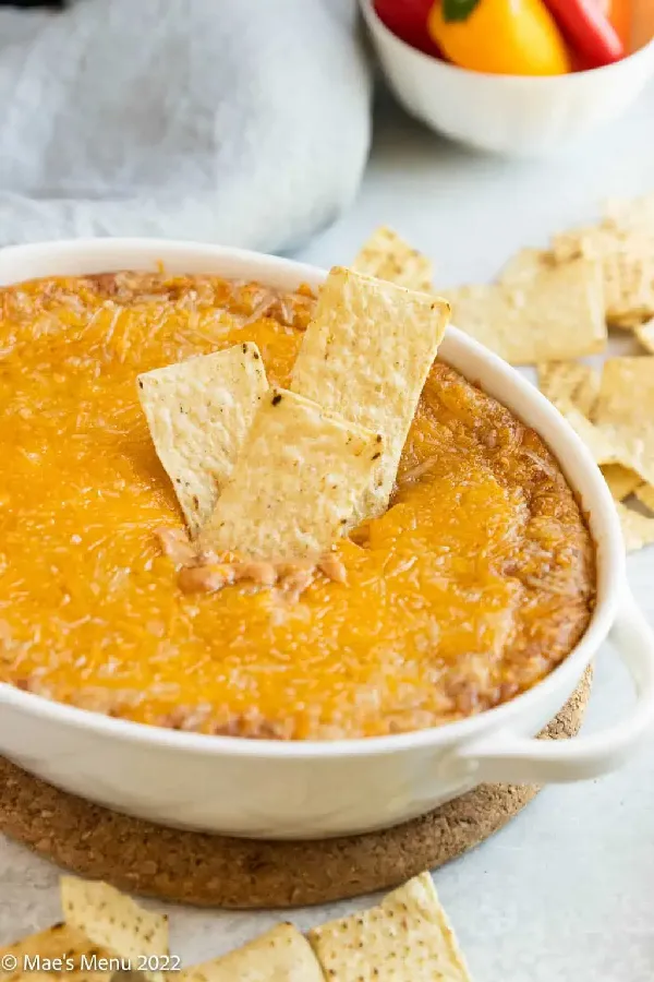 Creamy, cheesy, and so easy to make, this refried bean dip with cream cheese will be a hit at any get-together, gathering, potluck, or BBQ. It’s the kind of dip that has everyone hovering around the chip bowl all night long. Warm, comforting, and absolutely perfect for Cinco de Mayo.