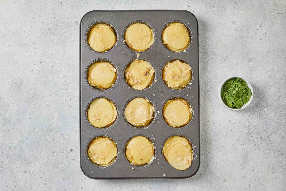 - Layer potato slices into each muffin cup, stacking to the top (they will shrink slightly during baking).