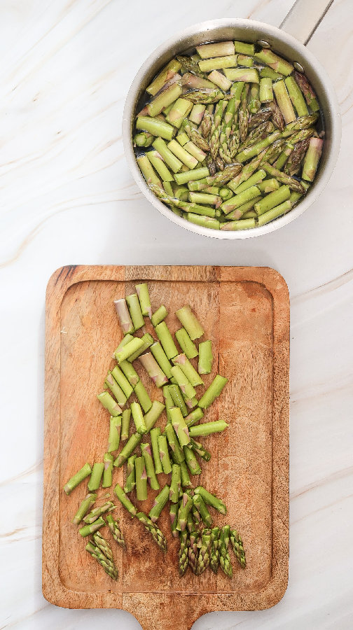 - Bring a pot of salted water to a boil. Add the asparagus and cook for 3-5 minutes until bright green and tender-crisp.