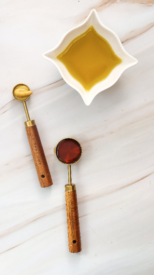 Put the olive oil, Dijon mustard, and maple syrup in a small bowl. Whisk it all together until it looks smooth. The maple syrup is small but important, it makes the mustard less sharp. Do not skip the maple syrup.