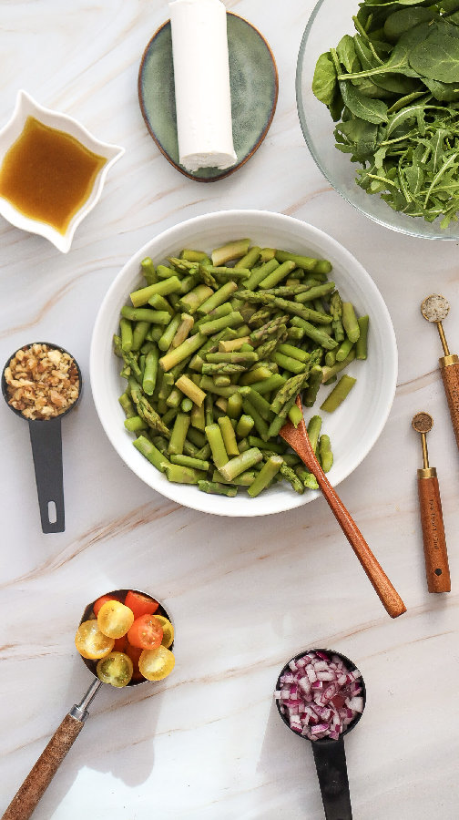 - In a large bowl, combine the blanched asparagus, mixed greens, cherry tomatoes, and red onion.