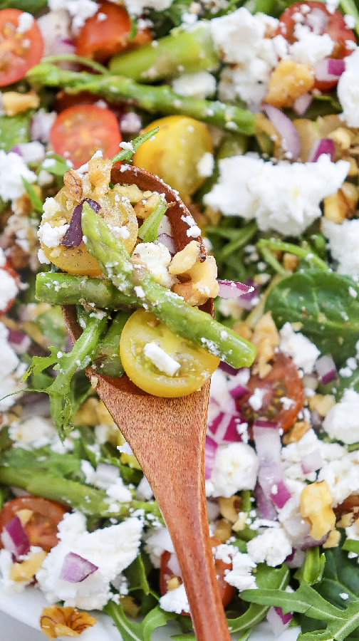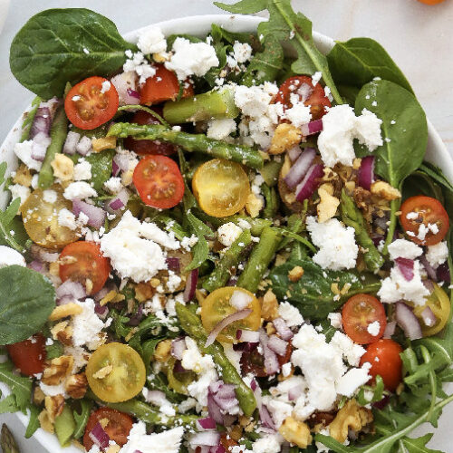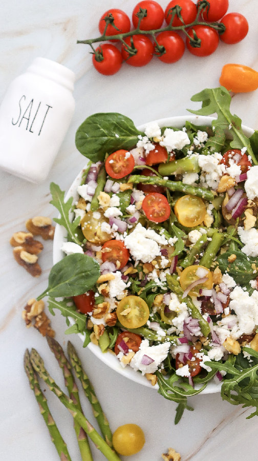 Get a big bowl. Add the asparagus, the greens, the tomatoes, and the red onion. Pour the dressing on top and toss it gently so everything gets coated. Add the salt and pepper now too. Be gentle when you toss it, you don’t want to smash the greens.