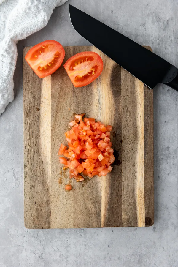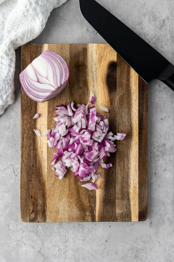 The half red onion needs to be chopped up pretty small. Set it aside with the tomatoes. If raw onion is too strong for you, soak the pieces in cold water for five minutes and drain them, it takes the sharp taste away.