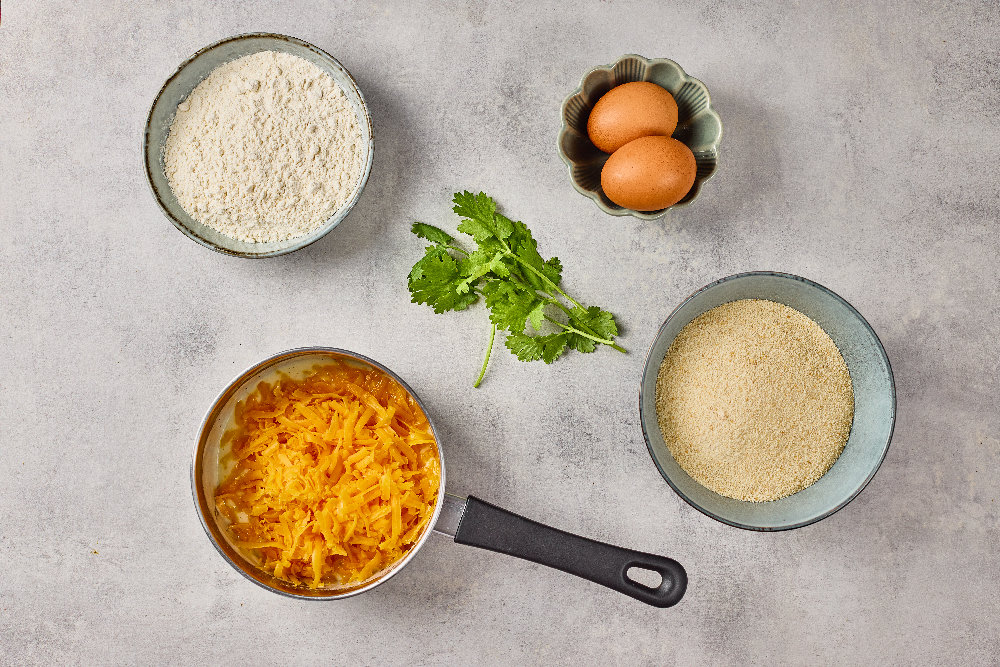 • Coat each ball in flour, dip in beaten eggs, then roll in breadcrumbs until fully coated.