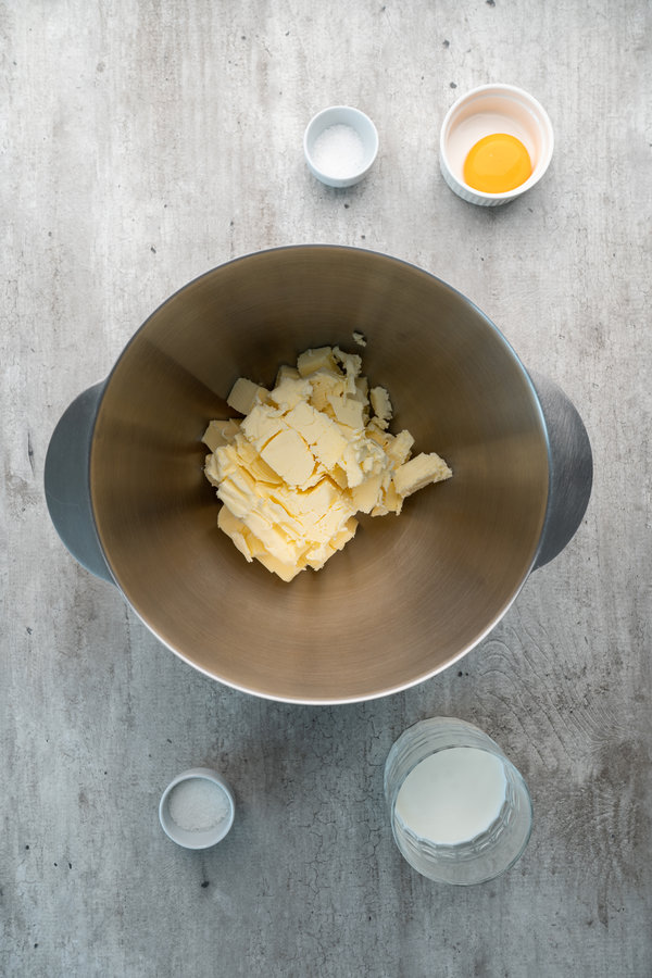 • In a large mixing bowl (or food processor), combine the softened butter, salt, egg yolk, sugar, and milk. Mix until smooth and creamy.