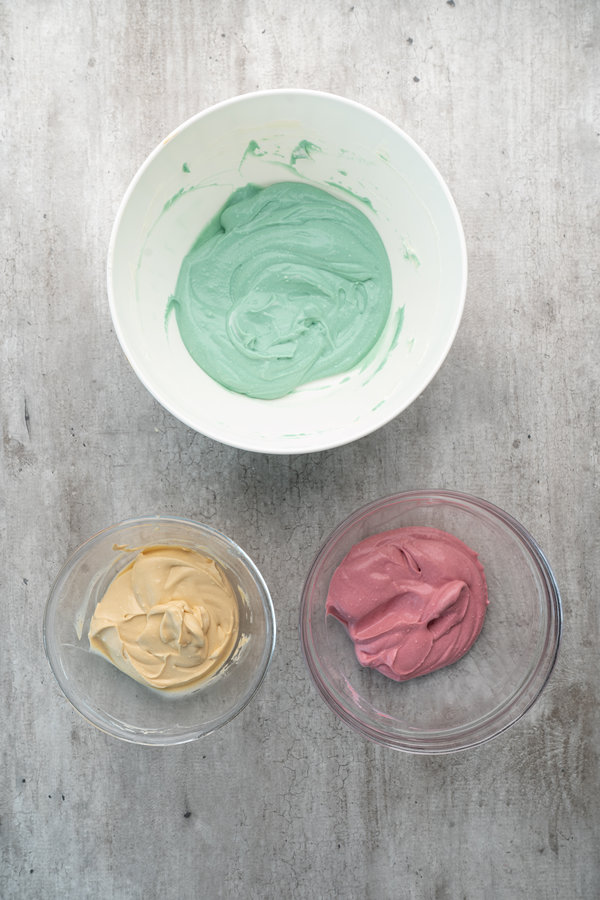 • Divide the filling into two (or more) bowls and add a drop of gel food colouring to each to create pastel shades. Mix until uniformly coloured.