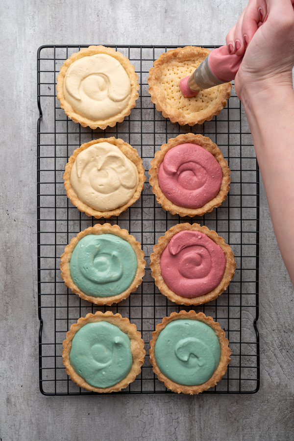 • Once the tart shells are completely cooled, spoon or pipe the coloured cheesecake filling into each shell, filling almost to the top.