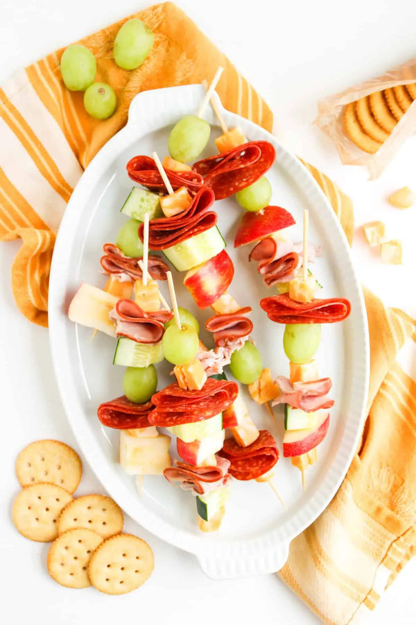 Juicy fruit, creamy Colby Jack, and salty bites of deli ham and pepperoni turn into colorful little kabobs in about 10 minutes.Thread them on wooden skewers or reusable picks, and boom: a grab-and-go snack board that feels special without any cooking.