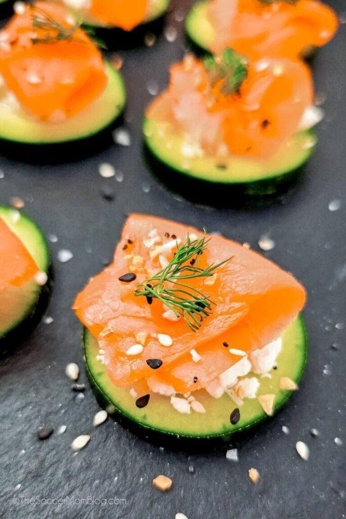 These tasty Salmon Cucumber Bites are a breeze to assemble, combining crisp cucumber, creamy feta, and savory smoked salmon for an elegant party appetizer or light snack.