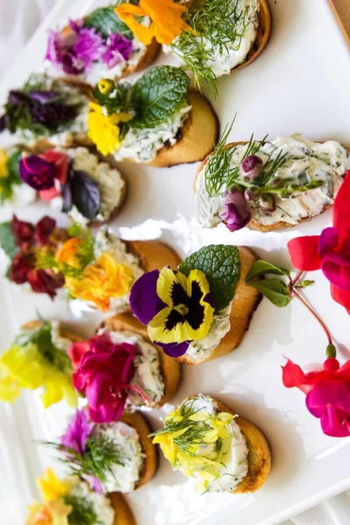Spring Crostini Appetizers are little toasts topped with a creamy cheese spread, edible flowers, and herbs for Easter, bridal showers, teas, or Mother’s Day.