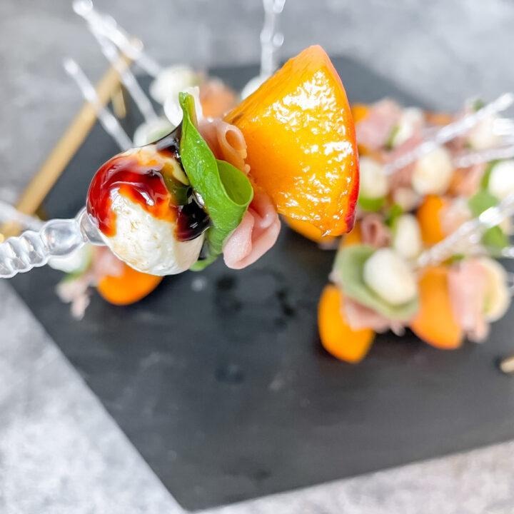 Try these Peach & Bocconcini Balsamic Bites at your next meal or party. They are simple to make with ripe peaches, mini bocconcini (or mozzarella), basil and prosciutto.