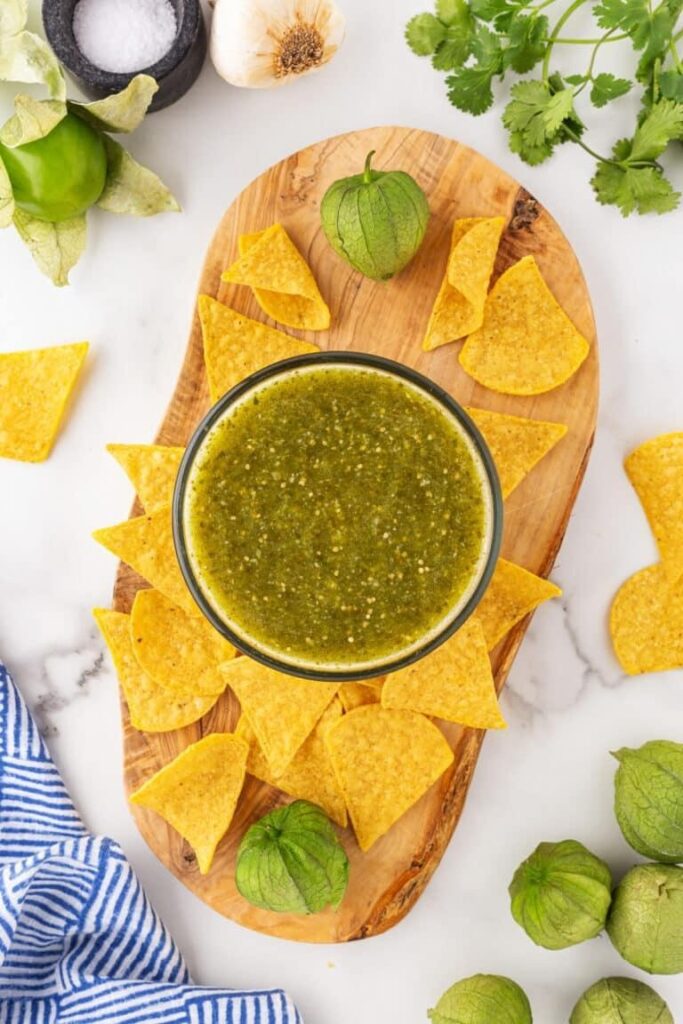 This Tomatillo Green Chili Salsa is a salsa verde like no other. Perfectly balanced ingredients give a punch of flavor to a simple tortilla chip.It is great to have on hand for everyday use, for a quick snack or as a wonderful condiment for Mexican meals.