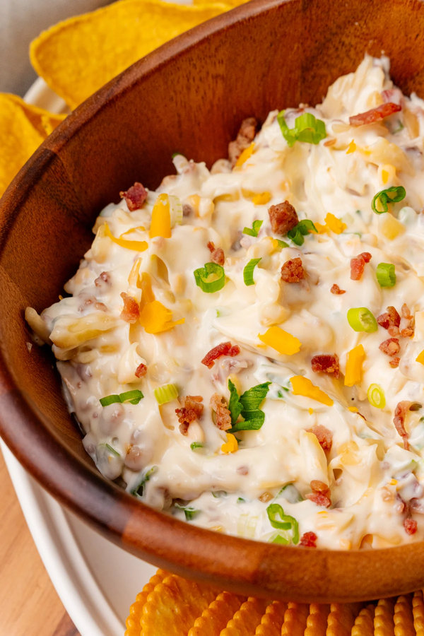 This easy dip recipe made with cheese, bacon, green onions, almonds and mayo is great to serve at parties, for game day or when you’re entertaining.