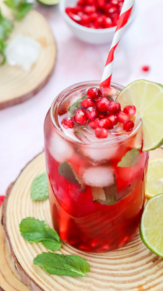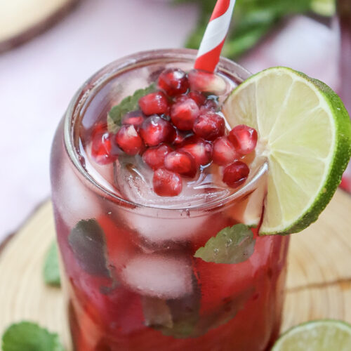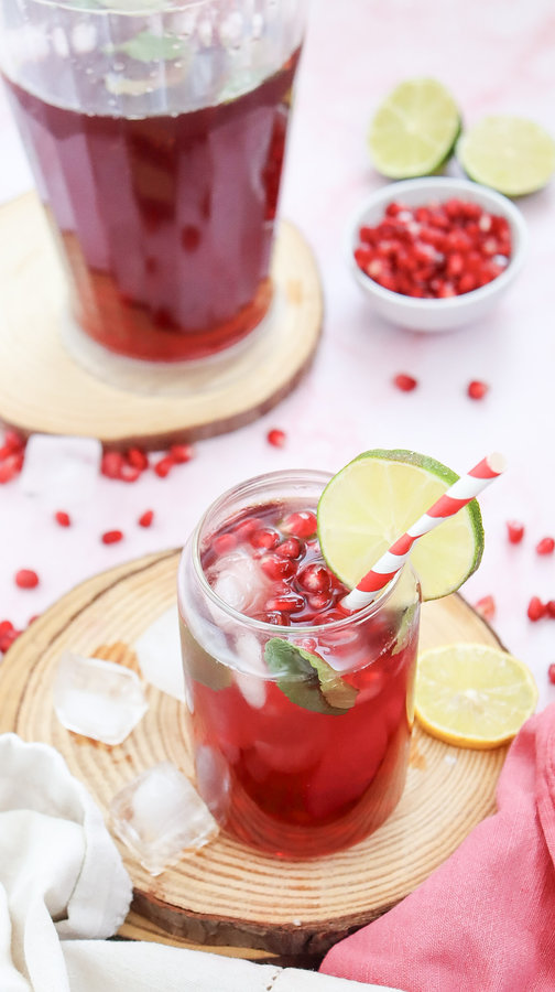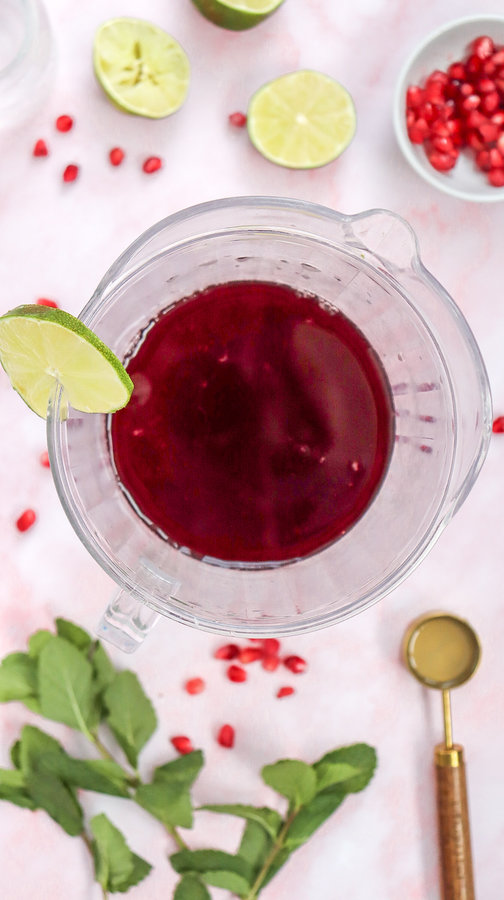 • Add fresh pomegranate seeds and lime slices to the jug for garnish.