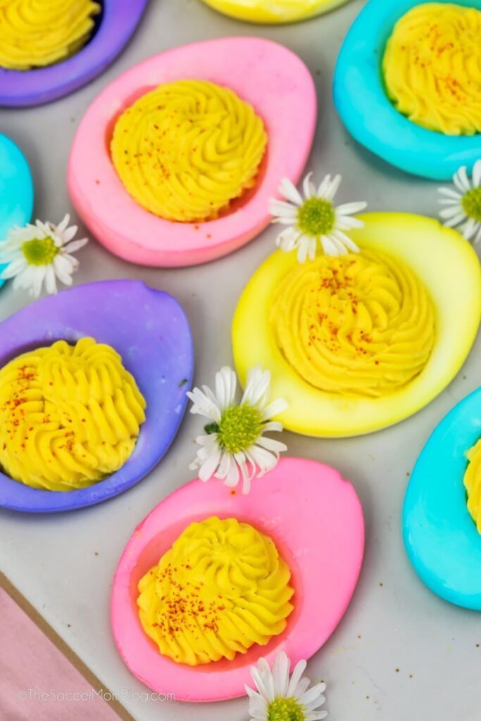 Brighten up your Easter table with these festive pastel deviled eggs! These colored deviled Easter eggs are a fun spin on this classic appetizer dish and perfect for Easter brunch.