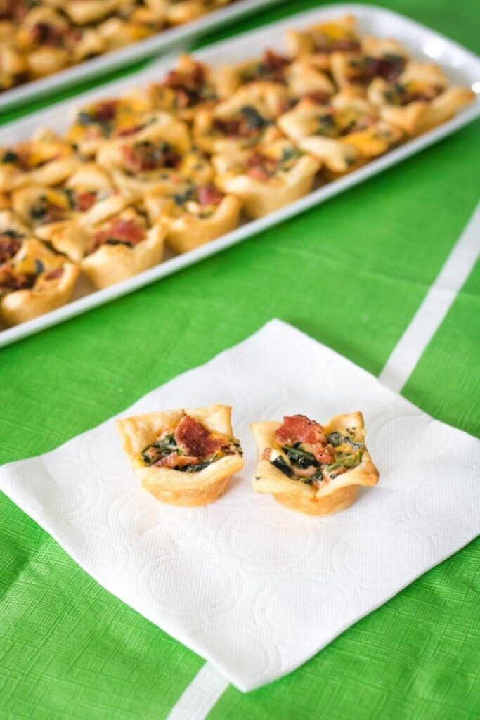 A delicious bite-sized appetizer made with a cheesy bacon spinach dip baked into a crescent dough cup. Perfect for the Big Game.