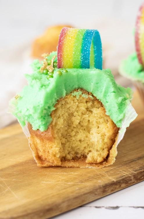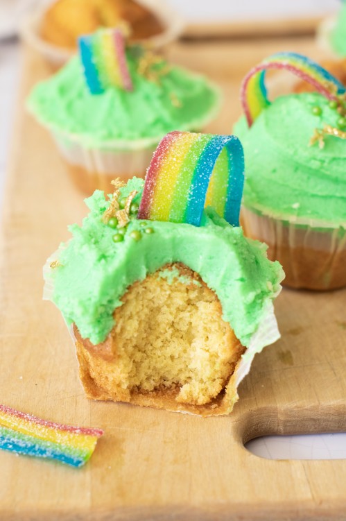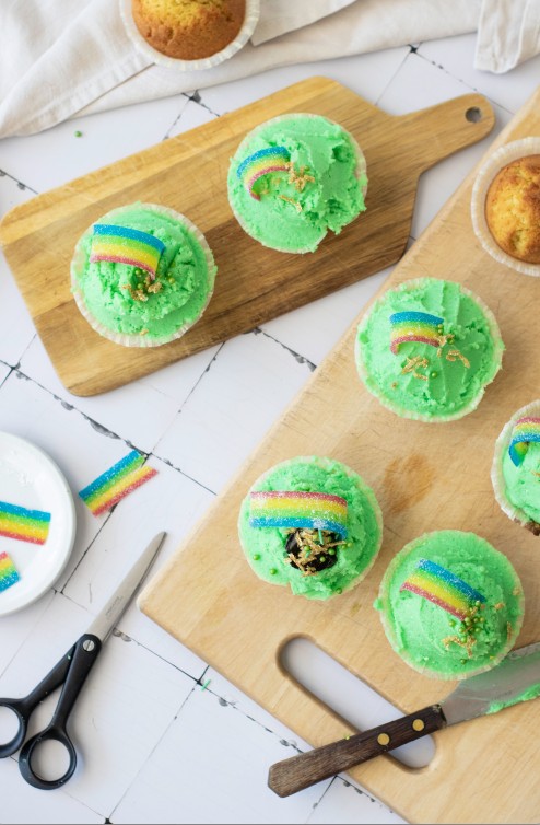 Green frosting! Rainbows made from candy strips on top with little gold sprinkles at the ends like treasure. St Patrick’s Day cupcakes perfection.
