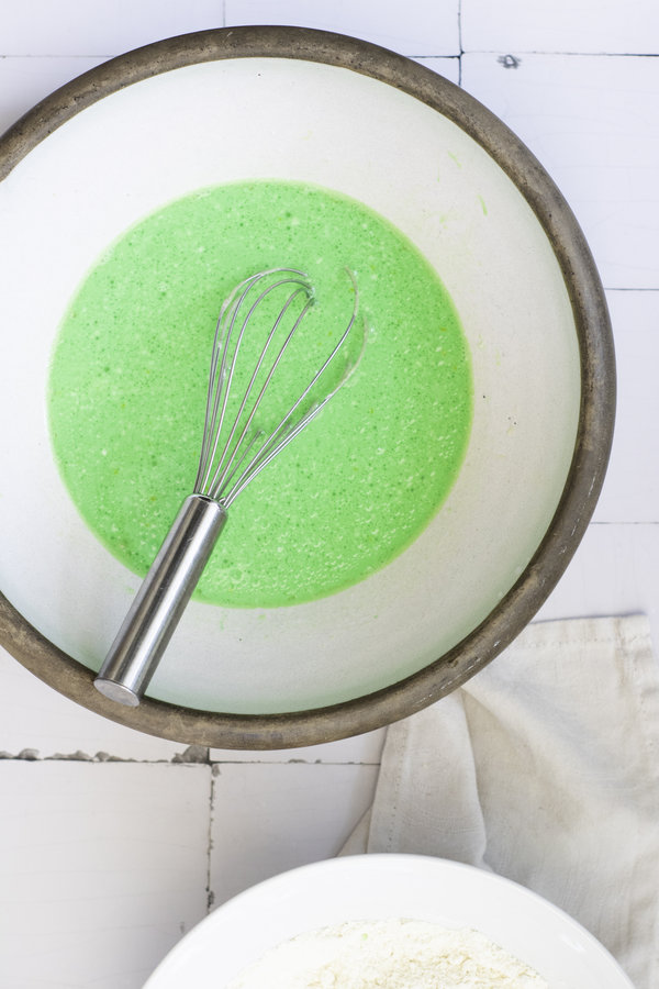 - In a separate bowl, whisk the buttermilk mixture, egg, oil, vanilla extract, and a few drops of green food coloring. Adjust the food coloring to reach your desired shade of green.