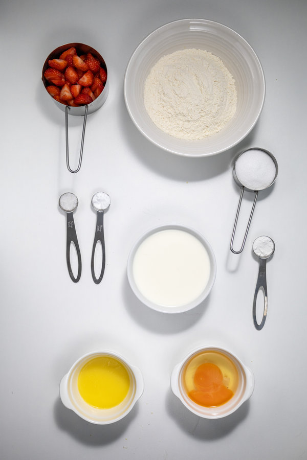 You need another bowl for this. Put the strawberries in with 5 tablespoons of sugar. That’s all the sugar you have left. Let it sit there for a bit while you do other stuff.