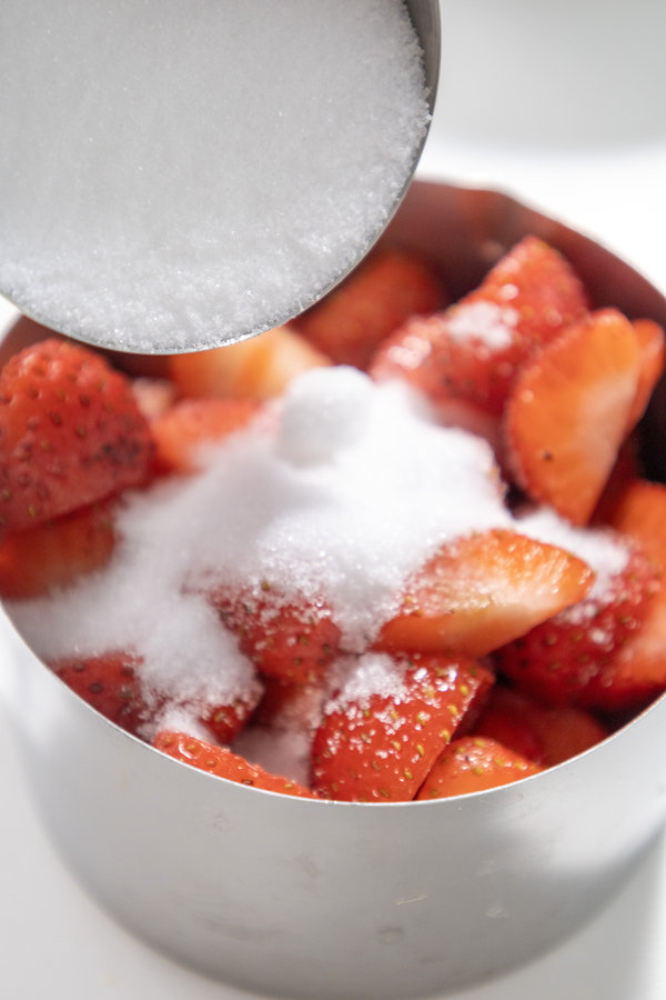 • In a separate bowl, mix the diced strawberries with the remaining granulated sugar (5tbsp) to release their juices. Set aside for a few minutes.