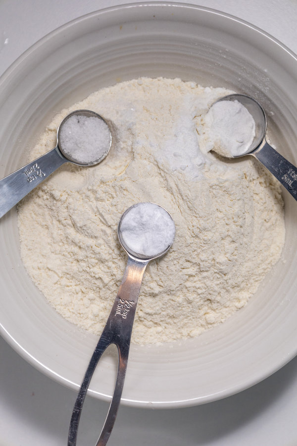 • In a mixing bowl, combine the all-purpose flour, 3 tbsp of granulated sugar, salt, baking soda, and baking powder. Mix well until all the dry ingredients are evenly incorporated.