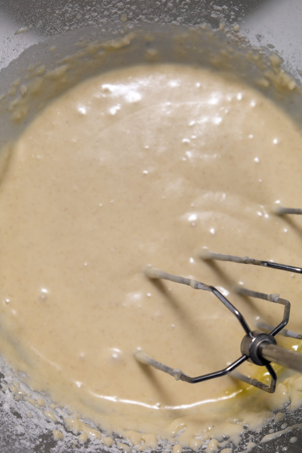 • Add the melted butter and eggs to the dry ingredients and mix until well combined. Gradually pour in the whole milk while stirring the batter. Mix until smooth and no lumps remain.