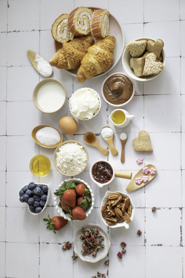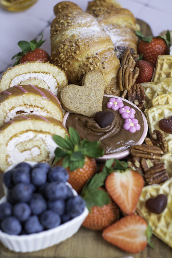 - Arrange the croissants around the waffles. Add the Swiss roll slices and the heart-shaped cookies.