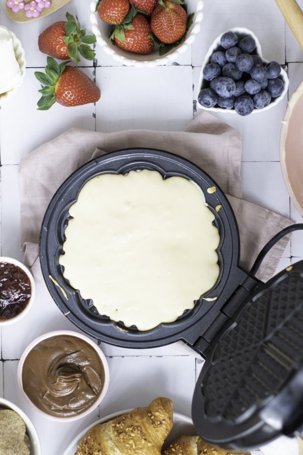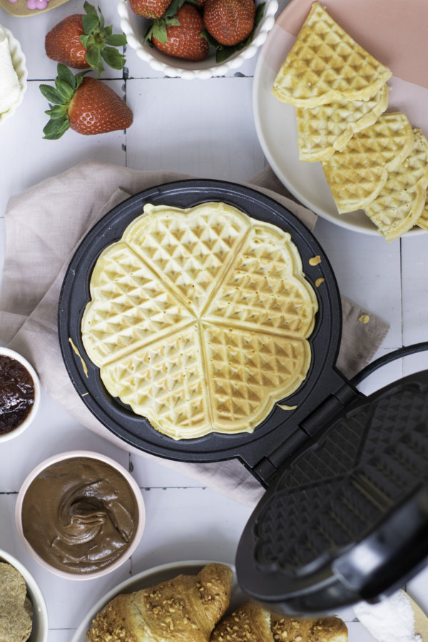 Turn on your waffle maker that’s shaped like hearts. Mine is a couple years old and I don’t use it much but for Valentine’s it’s perfect!