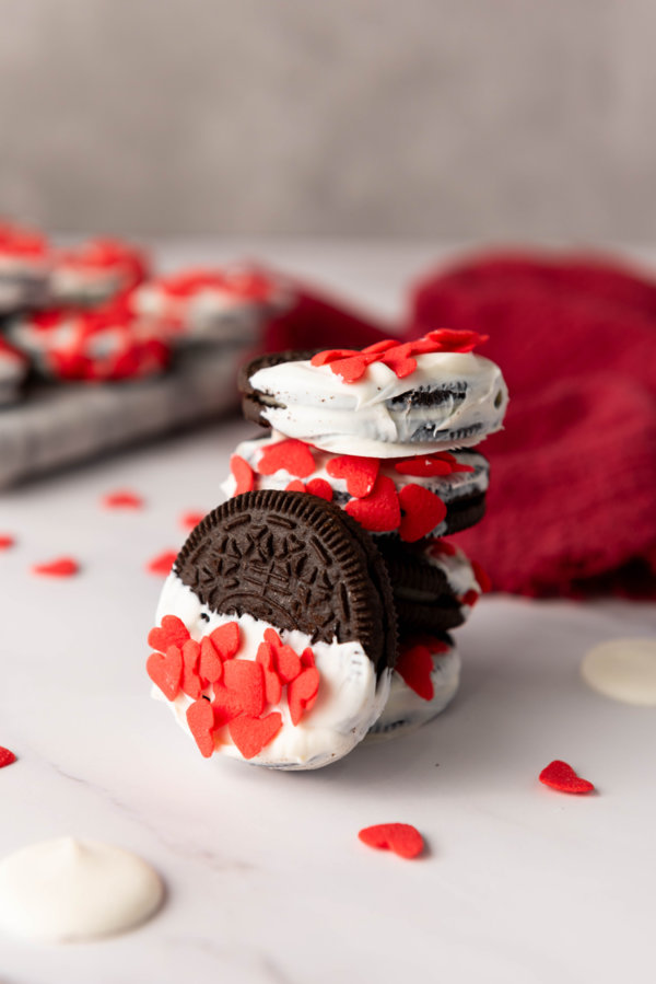 - Add Sprinkles: While the candy coating is still wet, sprinkle the red heart sprinkles over the top of each Oreo. Be generous to make them look festive!