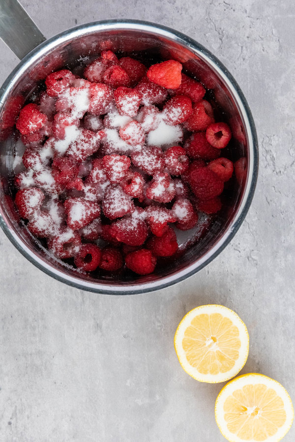 - In a saucepan, combine raspberries, sugar, and lemon juice. Cook over medium heat until the raspberries break down and the mixture thickens slightly. Let it cool and then strain to remove seeds, if desired.