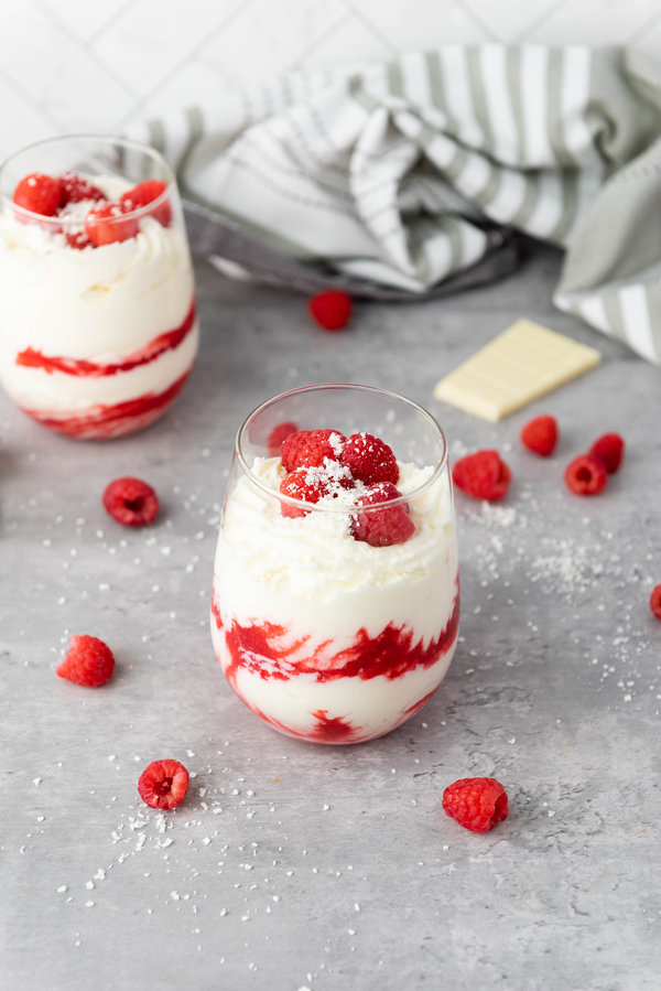 - Carefully spoon or pipe the white chocolate mousse over the raspberry layer, filling the glasses.